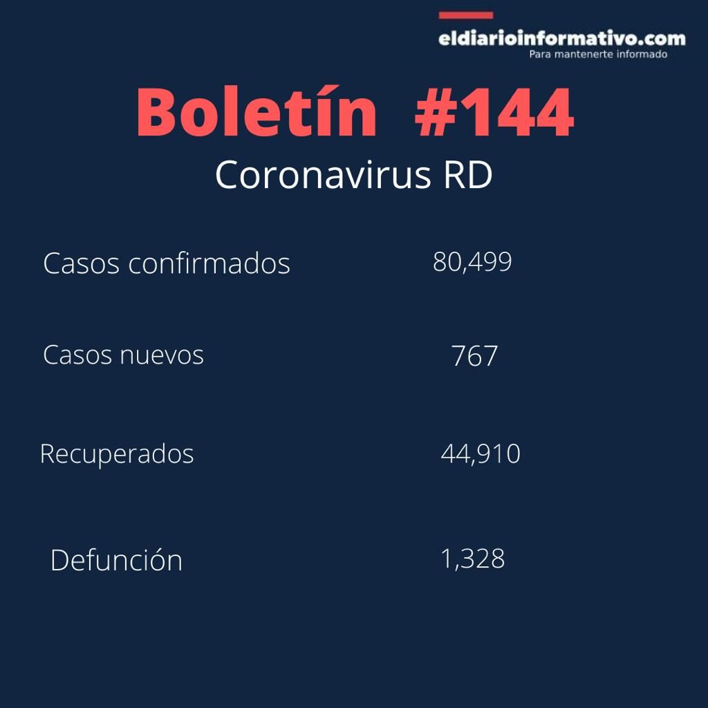 Hasta el 9 de agosto de 2020, en la República Dominicana se han reportado 80,499 casos confirmados (767 nuevos): 6,765 se encuentran en aislamiento hospitalario, 27,496 en aislamiento domiciliario, 44,910 recuperados y 1, 328 fallecidos (19 nuevos). Se encuentran 309 casos en Unidad de Cuidados Intensivos: 44.01% en centros del Gran Santo Domingo, 24.92% en Santiago y 13.92% en Duarte.