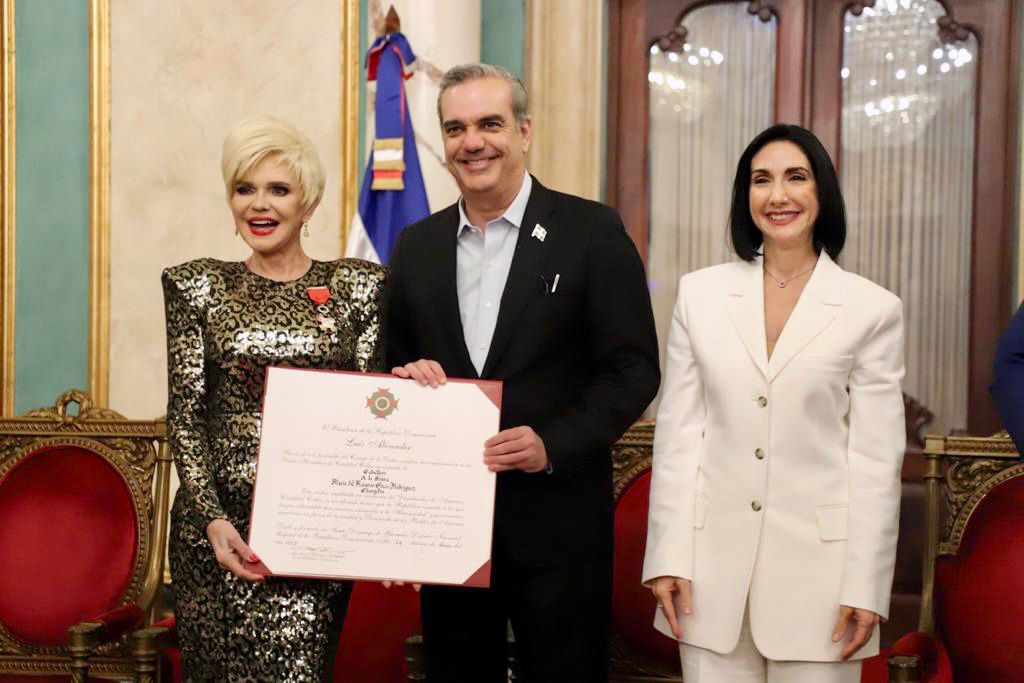 Santo Domingo. – El presidente Luis Abinader acompañado de la primera dama Raquel Arbaje, condecoró este martes con la Orden Heráldica de Cristóbal Colón en el Grado de Caballero, al destacado comunicador Ramón Rodríguez (Negro) Santos y a la artista María del Rosario Goico Rodríguez, mejor conocida como Charytín Goico.